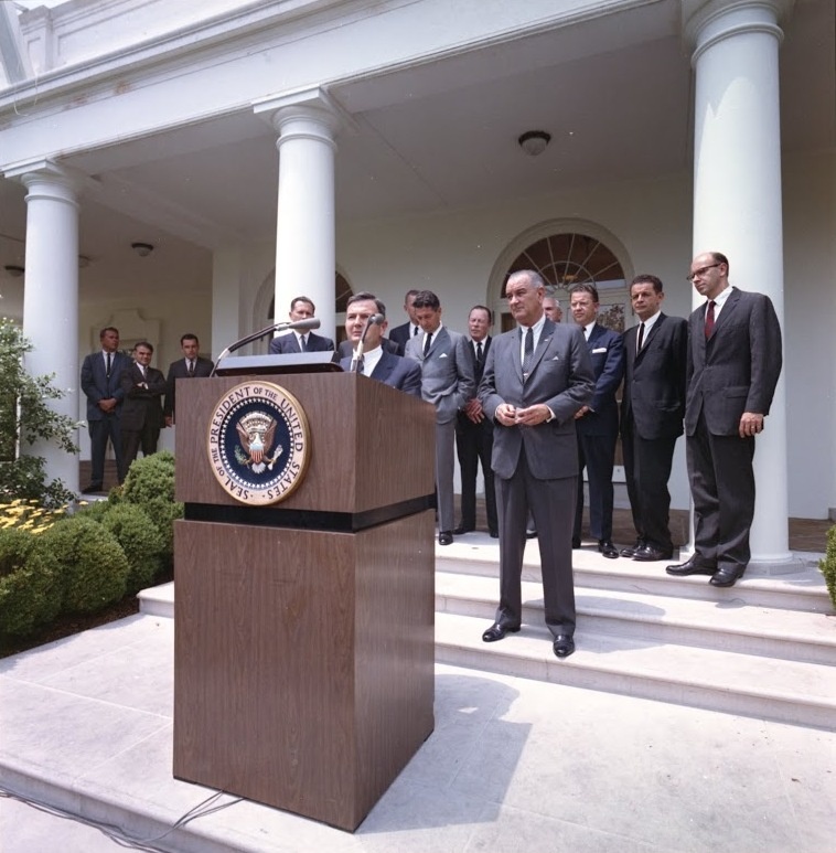 (↑ 写真は、ジョンソン大統領とデイヴィッド・ロックフェラー/1964年)